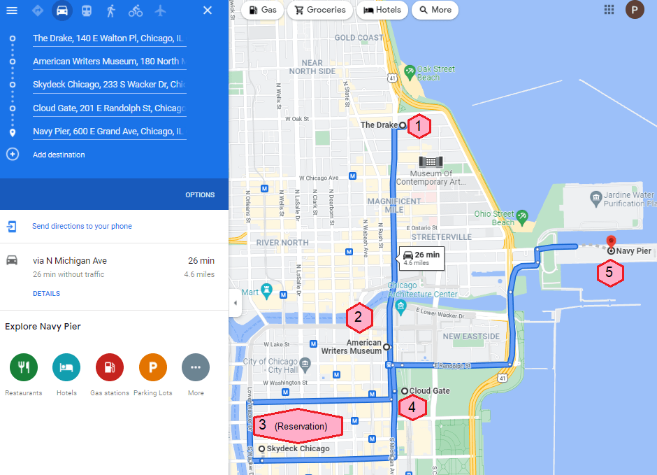 Use your hotel as the starting location, and add each destination to the directions. You may need to use a few browser-tabs. Click and drag each destination on the map to create an orderly route from one point of interest to another. Here’s an example: